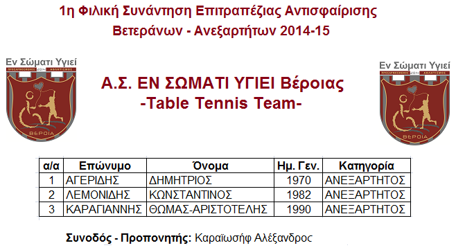 Ο Πανελλήνιος Όμιλος Φίλων Επιτραπέζιας Αντισφαίρισης (Π.Ο.Φ.Επ.Α.), σε συνεργασία με την Ελληνική Φίλαθλο Ομοσπονδία Επιτραπέζιας Αντισφαίρισης (Ε.Φ.Ο.Επ.Α.), προκήρυξαν πριν λίγες ημέρες την 1η Φιλική Συνάντηση Επιτραπέζιας Αντισφαίρισης Βετεράνων-Ανεξαρτήτων αθλητών και αθλητριών περιόδου 2014-2015 (Ομαδικό). Δικαίωμα συμμετοχής έχουν ομάδες αποτελούμενες από 2 εώς 4 αθλητές και αθλήτριες Βετεράνους (παλιοί αθλητές άνω των 40 ετών) ή/και Ανεξάρτητους (μη επίσημους αθλητές άνω των 18 ετών).