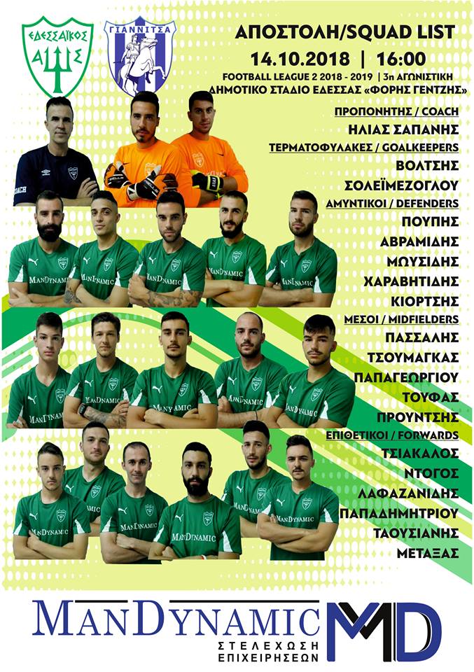 Γ Εθνική / Τοπικά 13 Οκτωβρίου 2018 στις 15:36 #Εδεσσαϊκός Η αποστολή του Εδεσσαϊκού για το τοπικό ντέρμπι με τον ΑΣ Γιαννιτσά SHARE Μετά την ανακοίνωση της αποστολής από πλευράς ΑΣ Γιαννιτσών (ΕΔΩ), σειρά πήρα και ο Εδεσσαϊκός που έκανε γνωστούς τους ποδοσφαιριστές που θα βρίσκονται στη διάθεση του Ηλία Σαμπάνη. Αναλυτικά : Storyteller: