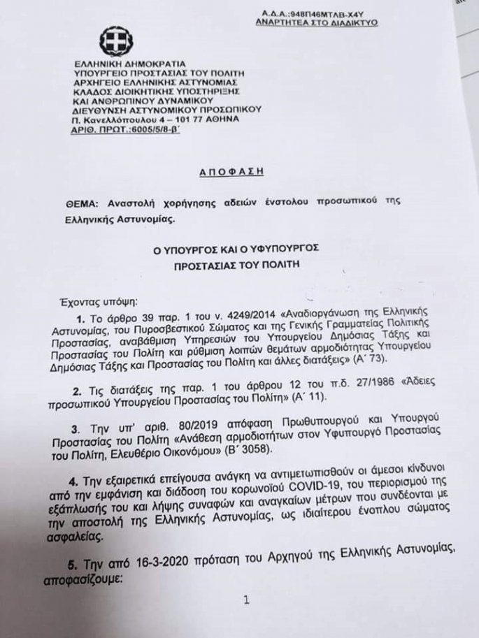 «Έχοντας υπόψη: 1. Την εξαιρετικά επείγουσα ανάγκη να αντιμετωπιστούν οι άμεσοι κίνδυνοι από την εμφάνιση και διάδοση του κορονοϊού, του περιορισμού της εξάπλωσής του και λήψης συναφών και αναγκαίων μέτρων που συνδέονται με την αποστολή της Αστυνομίας, ως ιδιαίτερου ένοπλου σώματος ασφαλείας.