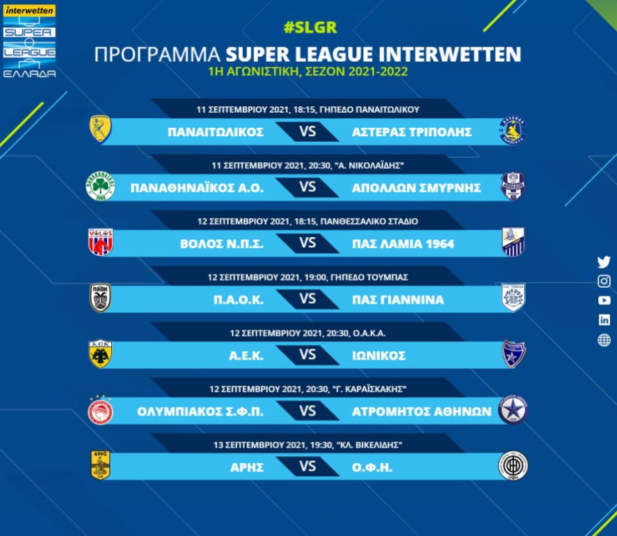 Super League 1 02 Σεπτεμβρίου 2021 στις 15:27 Η Super League ανακοίνωσε το πρόγραμμα της 1ης αγωνιστικής SHARE Επιτέλους σέντρα στο…πολύπαθο πρωτάθλημα της Super League 1. Αφού βρέθηκε η λύση με τα τηλεοπτικά και εγκρίθηκε η προκήρυξη, η διοργανώτρια προχώρησε στον ορισμό των αγώνων της πρεμιέρας του πρωταθλήματος.