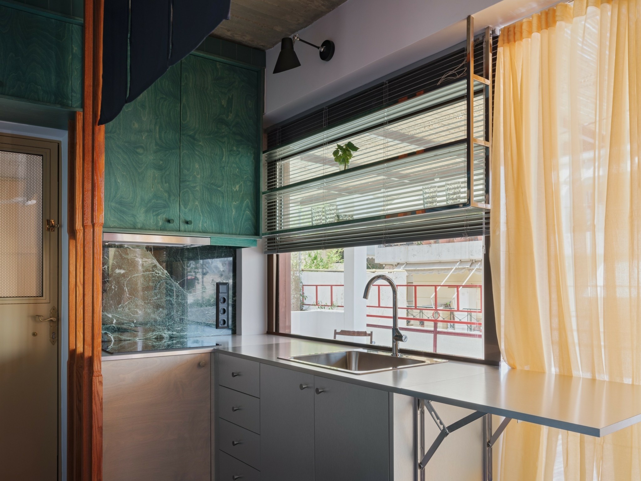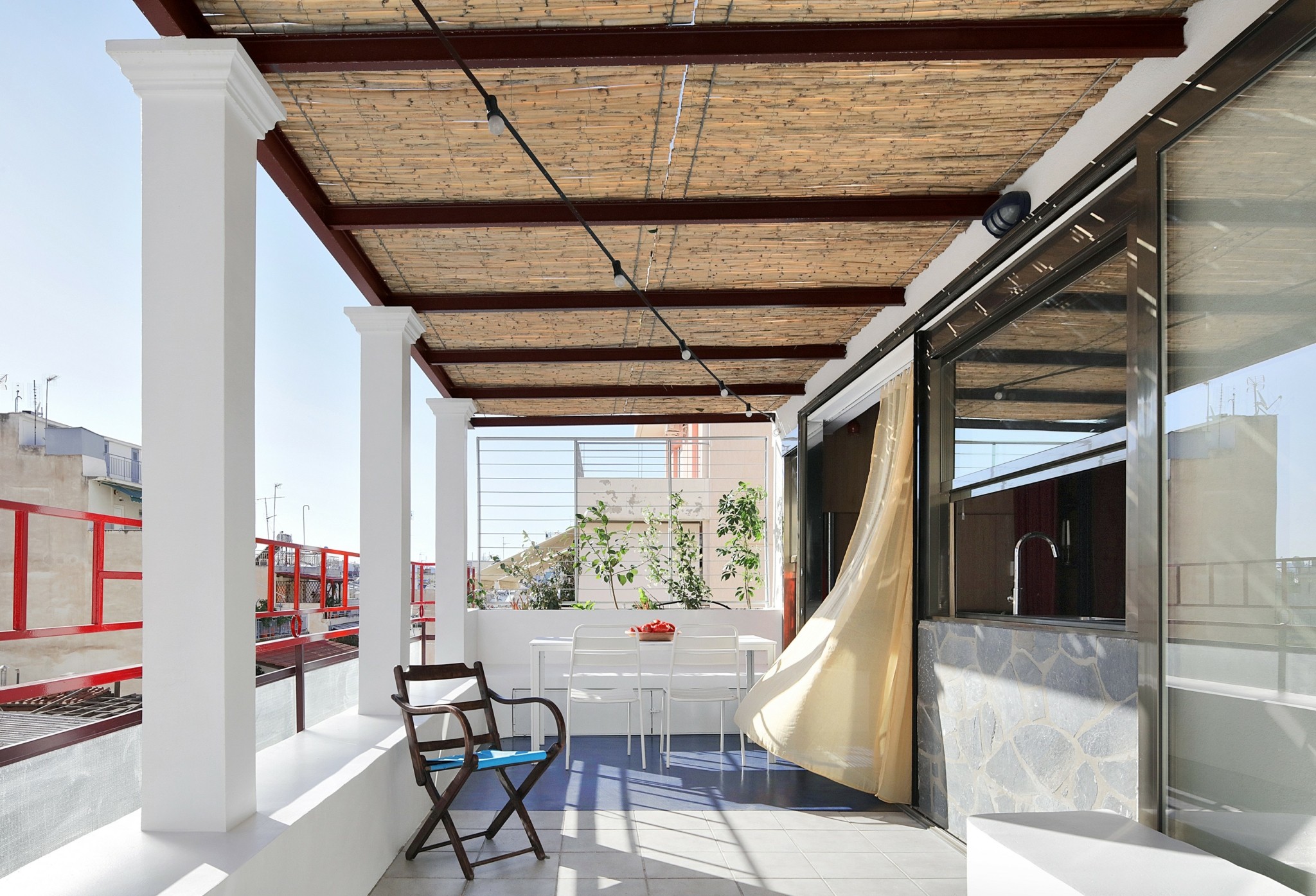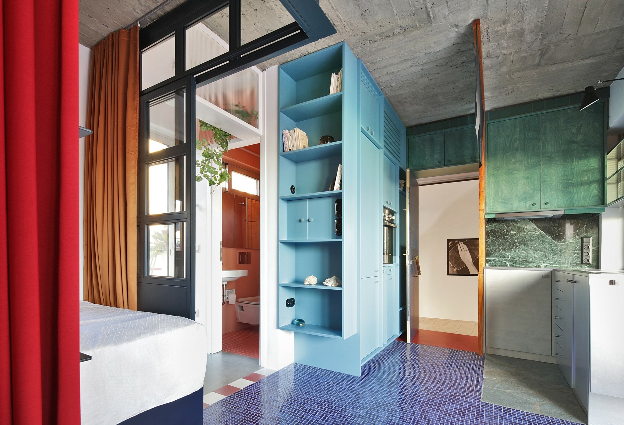 Χτίσαμε έναν πυκνό μικρόκοσμο που δημιουργεί την ψευδαίσθηση ενός χώρου δίχως τέλος. Αυτό, χάρη στις διάφορες κατασκευές, δημιουργεί υποχώρους. Έτσι, εκτός από το βασικό, σταθερό υπνοδωμάτιο, υπάρχει και ένα καθιστικό που μετατρέπεται σε δεύτερο χώρο ύπνου για δύο άτομα, με χρήση συρόμενων διαχωριστικών και κουρτινών που αγκαλιάζουν τον χώρο. Η βεράντα επίσης έχει κατασκευές που την κάνουν να μοιάζει με ένα ακόμα μεγάλο δωμάτιο. Η τζαμαρία ανάμεσα στο διαμέρισμα και τη βεράντα εξαφανίζεται, οπότε το διαμέρισμα μοιάζει να επεκτείνεται επ’ αόριστον.