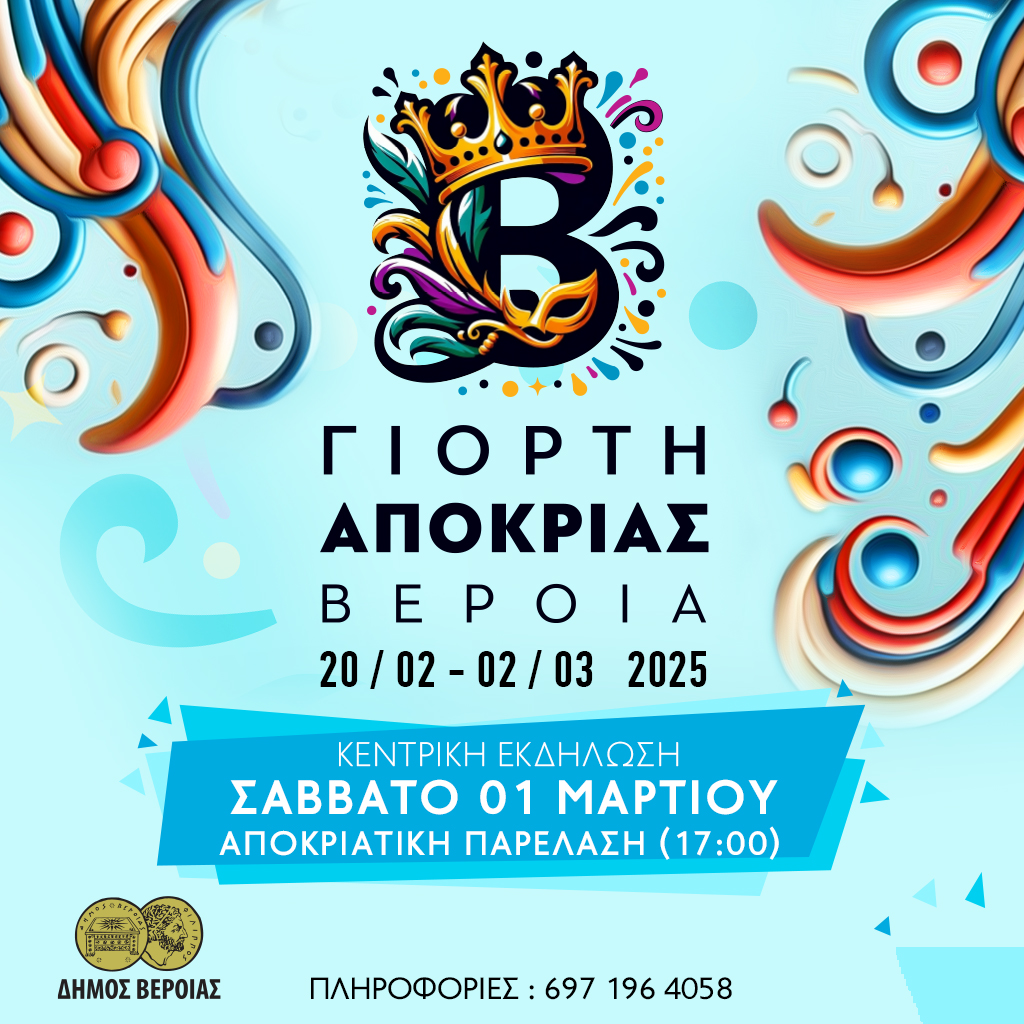 Ο Δήμος Βέροιας μας προσκαλεί να ζήσουμε τη μαγεία της Αποκριάς στη “ΓΙΟΡΤΗ ΑΠΟΚΡΙΑΣ ΒΕΡΟΙΑ” με μια σειρά από μοναδικές εκδηλώσεις που θα πραγματοποιηθούν από την Πέμπτη 20 Φεβρουαρίου (Τσικνοπέμπτη) έως και την Κυριακή 2 Μαρτίου.