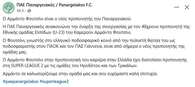 Ο Αρμάντο Φουτσίνι είναι ο νέος προπονητής του Παναργειακού, στη δύσκολη συνέχεια της Super League 2.