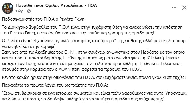 Ο Ατσαλένιος ανακοίνωσε την απόκτηση του Ρενάτο Γκίνη. Ο 24χρονος Αλβανός ποδοσφαιριστής, αγωνίζεται κυρίως στα “φτερά” της επίθεσης αλλά με ευκολία μπορεί να κινηθεί και στην κορυφή.
