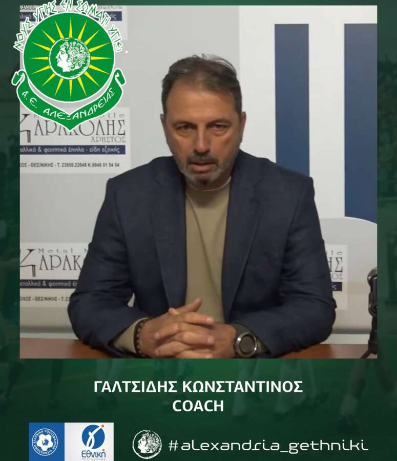 «Η Α.Ε. Αλεξάνδρειας βρίσκεται στην ευχάριστη θέση να ανακοινώσει την έναρξη συνεργασίας με τον έμπειρο τεχνικό Γαλτσίδη Κωνσταντίνο. Την περασμένη σεζόν εργάστηκε στον Θερμαϊκό Θέρμης και τον Παναιγιάλειο, ενώ το βιογραφικό του περιλαμβάνει μια σειρά από ομάδες όπως: Απόλλων Καλαμαριάς, Αναγέννηση Επανομής, Αγροτικός Αστέρας, Κεραυνός Αγγελοχωρίου, Θύελλα Σαρακηνών, Χανιώτη, Ερμιονίδα, Κιλκισιακός, Τρίγλια, Ποσειδώνας Καλαμαριάς».