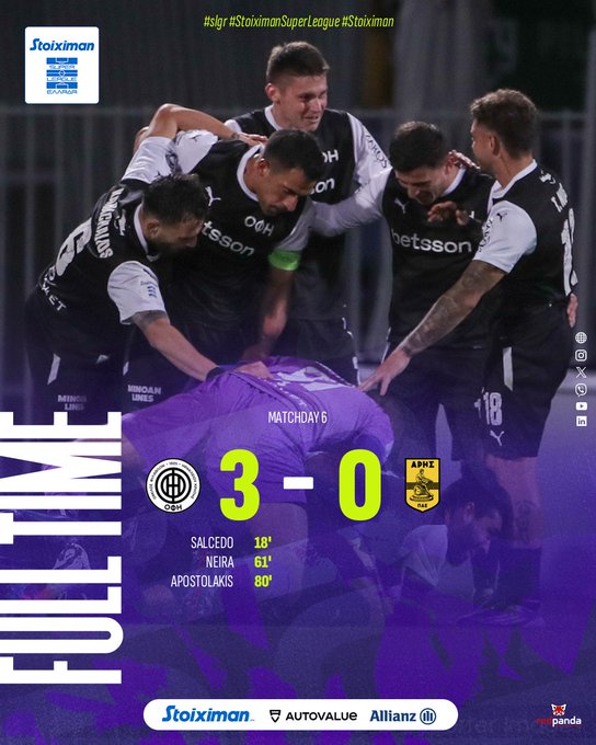 Με πειστική εμφάνιση και απόλυτη συγκέντρωση σε όλη τη διάρκεια του αγώνα, ο ΟΦΗ επικράτησε με 3-0 του Άρη στο ουδέτερο «Θεόδωρος Κολοκοτρώνης» της Τρίπολης, ανοίγοντας με εμφατικό τρόπο την αυλαία της 6ης αγωνιστικής της Super League. Η ομάδα του Μίλαν Ράσταβατς έβαλε τέλος στο αρνητικό σερί τριών ηττών και έδειξε πως μπορεί να σταθεί με αξιώσεις, ακόμη και σε συνθήκες «εκτός έδρας».
