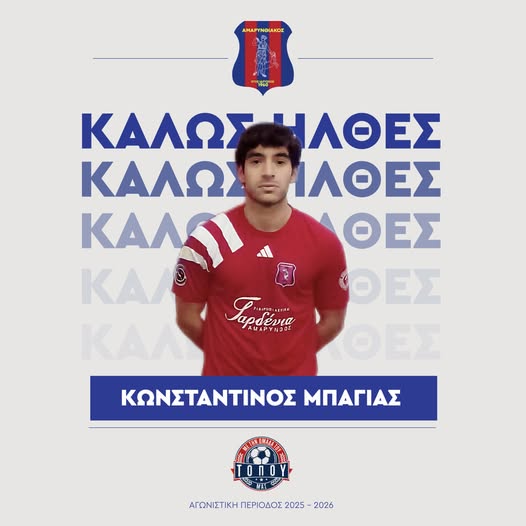 Την απόκτηση του 22χρονου επιθετικού Κωνσταντίνου Μπάγια ανακοίνωσε ο Αμαρυνθιακός, ενισχύοντας τη γραμμή κρούσης ενόψει της νέας σεζόν. Ο Μπάγιας έχει αγωνιστεί στο παρελθόν με τη φανέλα του ΑΟ Τρίκαλα, του ΑΣ Μετεώρων και της Κ19 του Ιωνικού, φέρνοντας μαζί του σημαντικές εμπειρίες από τις προηγούμενες παρουσίες του.