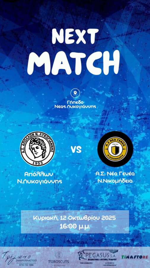 Ο Απόλλων Λυκογιάννης καλεί τους φιλάθλους του να γεμίσουν το γήπεδο την Κυριακή 12 Οκτωβρίου στις 16:00, στο εντός έδρας ντέρμπι με τη Νέα Γενεά Νικομήδειας για την 4η αγωνιστική της Β’ ΕΠΣ Ημαθίας.