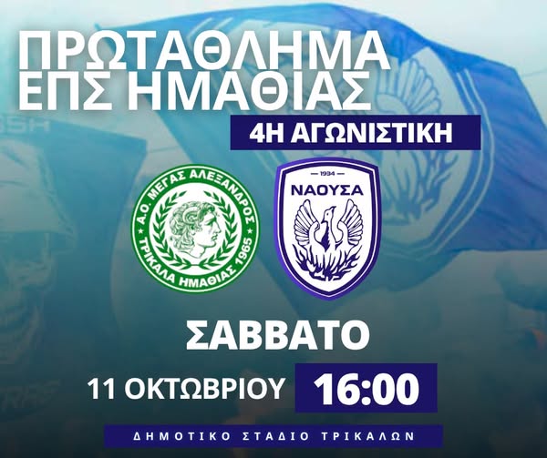 Το Σάββατο 11 Οκτωβρίου, η ομάδα μας ΝΑΟΥΣΑ FC αντιμετωπίζει εκτός έδρας τον Μέγα Αλέξανδρο Τρικάλων για την 4η αγωνιστική του πρωταθλήματος ΕΠΣ Ημαθίας.