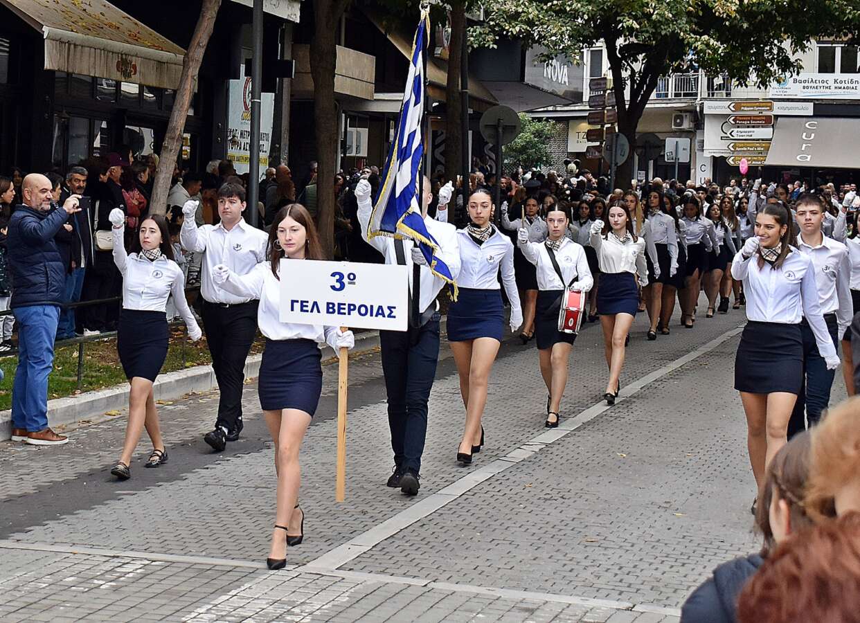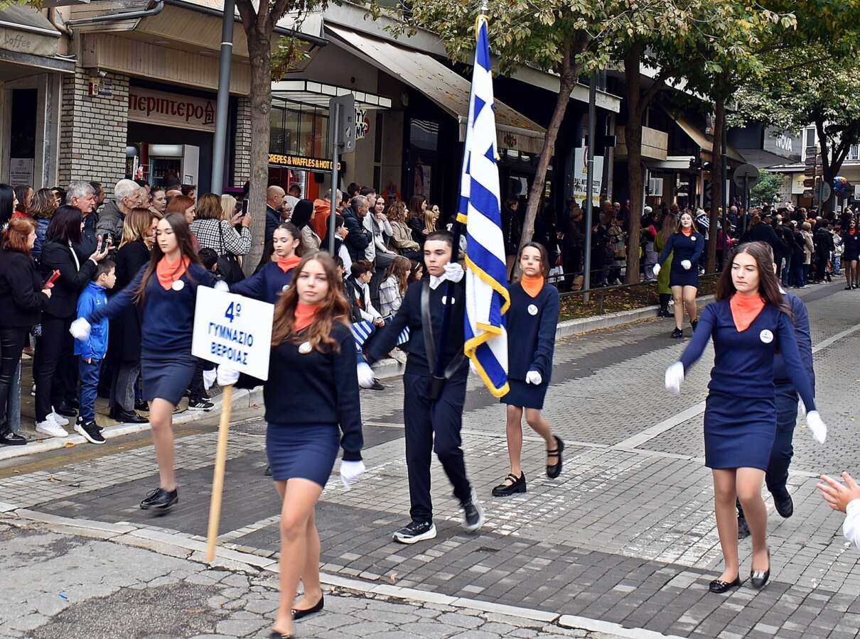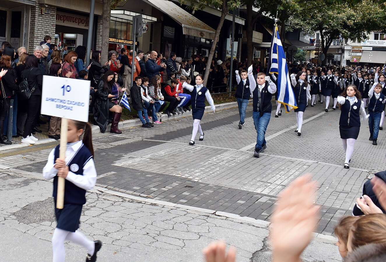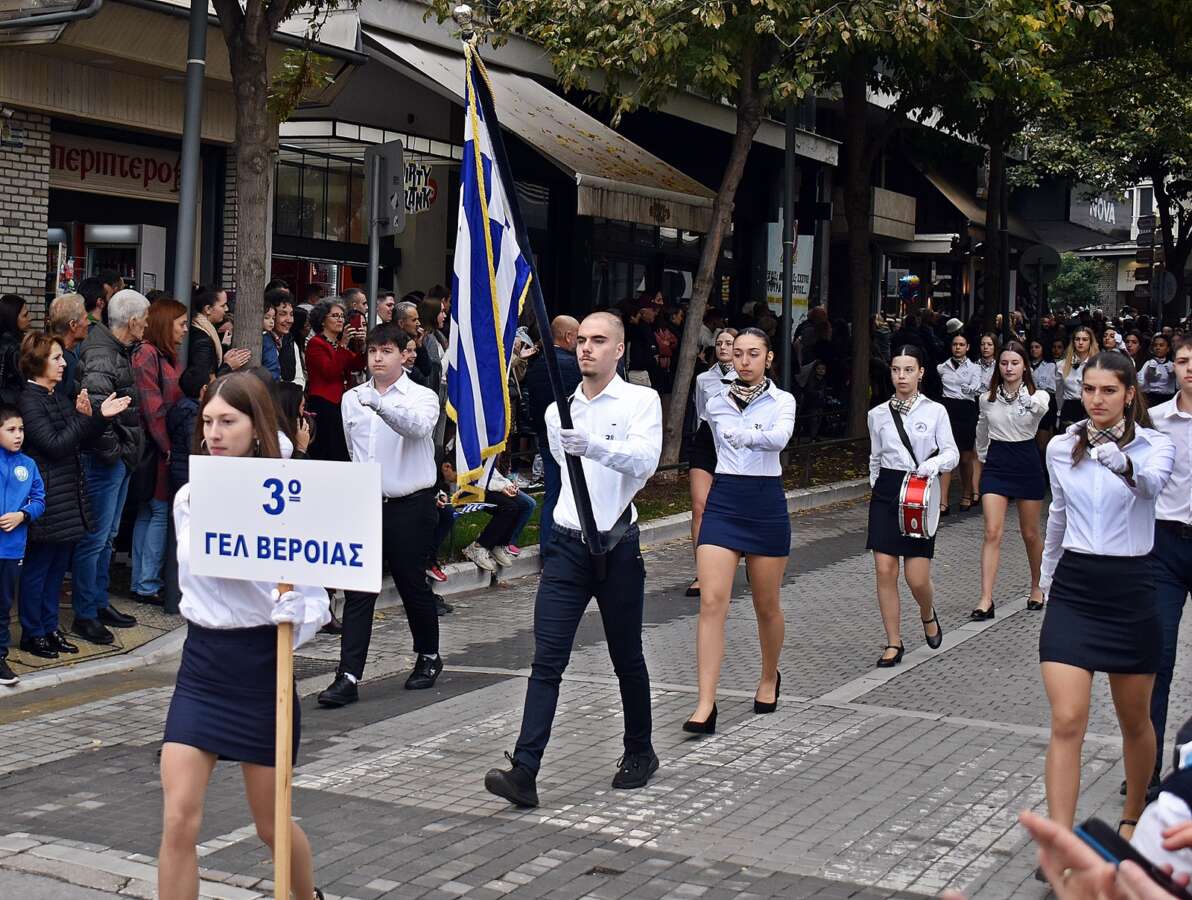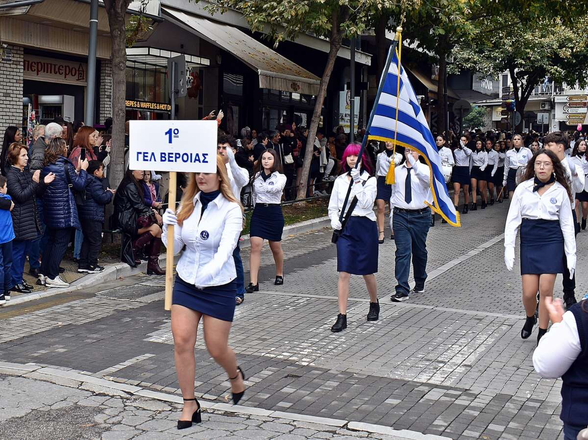 Οι εκδηλώσεις κορυφώθηκαν το πρωί στο κέντρο της πόλης, με τη μαθητική και στρατιωτική παρέλαση να συγκεντρώνει πλήθος πολιτών που κατέκλυσαν τους δρόμους, αποτίοντας φόρο τιμής στους ήρωες και χειροκροτώντας με υπερηφάνεια τη νεολαία της Βέροιας.