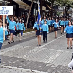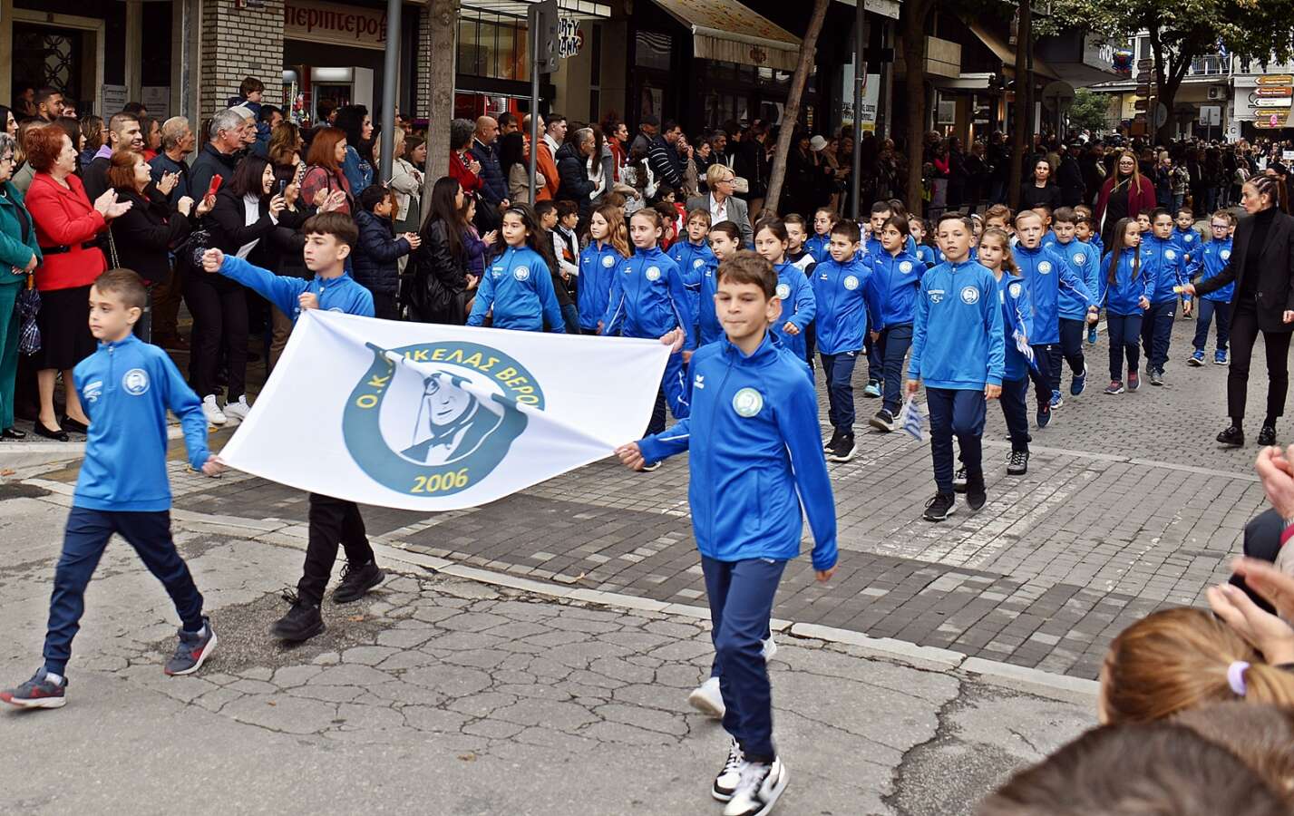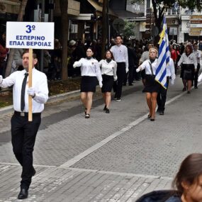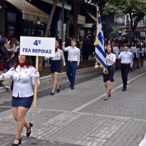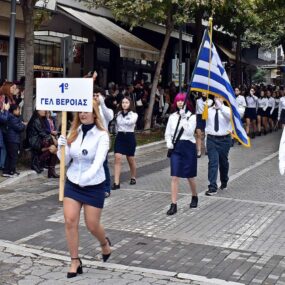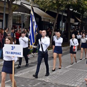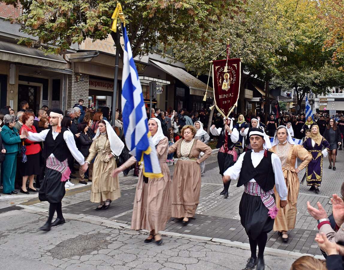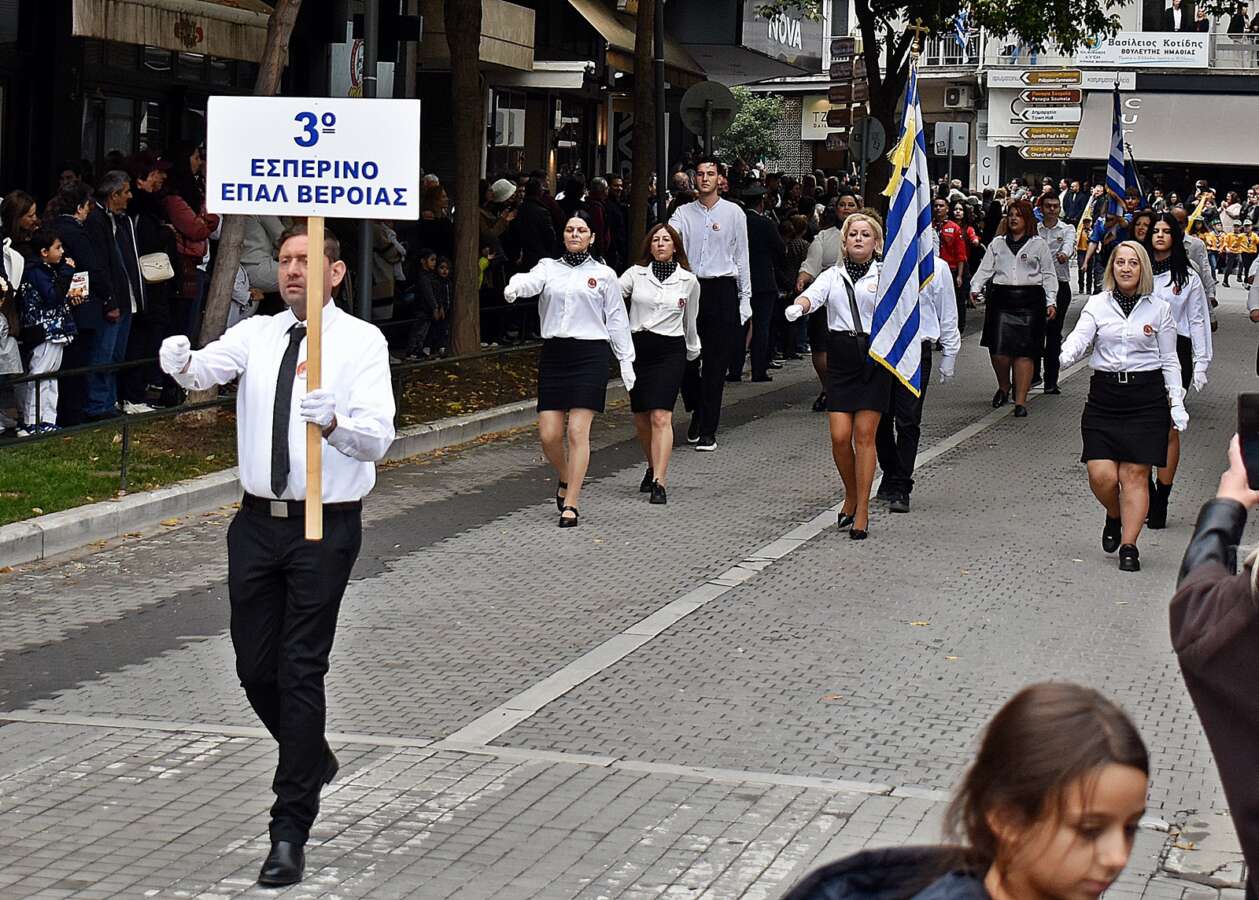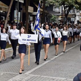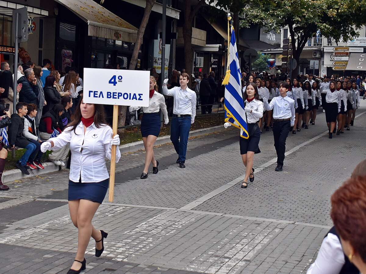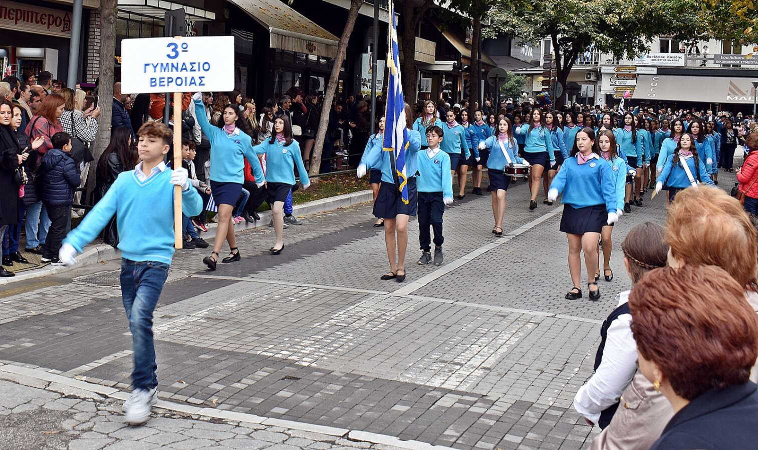 Οι εκδηλώσεις κορυφώθηκαν το πρωί στο κέντρο της πόλης, με τη μαθητική και στρατιωτική παρέλαση να συγκεντρώνει πλήθος πολιτών που κατέκλυσαν τους δρόμους, αποτίοντας φόρο τιμής στους ήρωες και χειροκροτώντας με υπερηφάνεια τη νεολαία της Βέροιας.