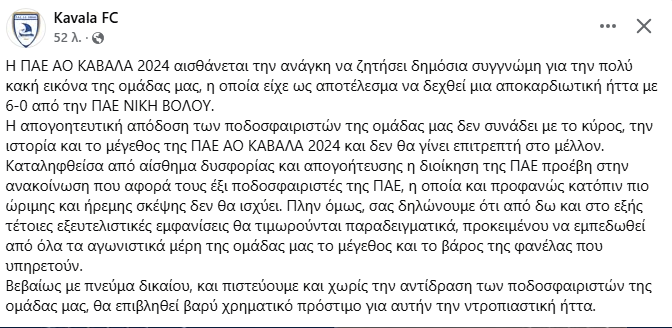 Σε αναδίπλωση προχώρησε η ΠΑΕ Καβάλα, μετά τις έντονες αντιδράσεις που προκάλεσε η ανακοίνωση περί αποδέσμευσης έξι ποδοσφαιριστών. Με νέα τοποθέτηση, η διοίκηση της ομάδας ζήτησε δημόσια συγγνώμη για τη βαριά ήττα (6-0) από τη Νίκη Βόλου, διευκρινίζοντας πως η προηγούμενη ανακοίνωση εκδόθηκε εν βρασμώ ψυχής και δεν θα ισχύσει.