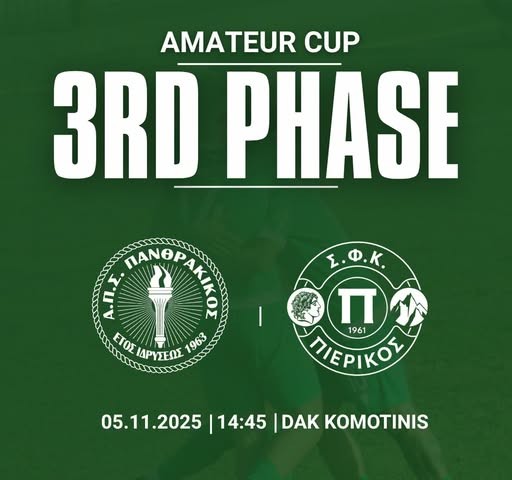 Αλλαγή σημειώθηκε στην ημερομηνία και ώρα διεξαγωγής της αναμέτρησης Πανθρακικός – Πιερικός για την 3η φάση του Κυπέλλου Ερασιτεχνών. Ο αγώνας, που αρχικά είχε προγραμματιστεί για την Τετάρτη 29 Οκτωβρίου, θα διεξαχθεί τελικά την Τετάρτη 5 Νοεμβρίου στις 14:45 στο ΔΑΚ Κομοτηνής.