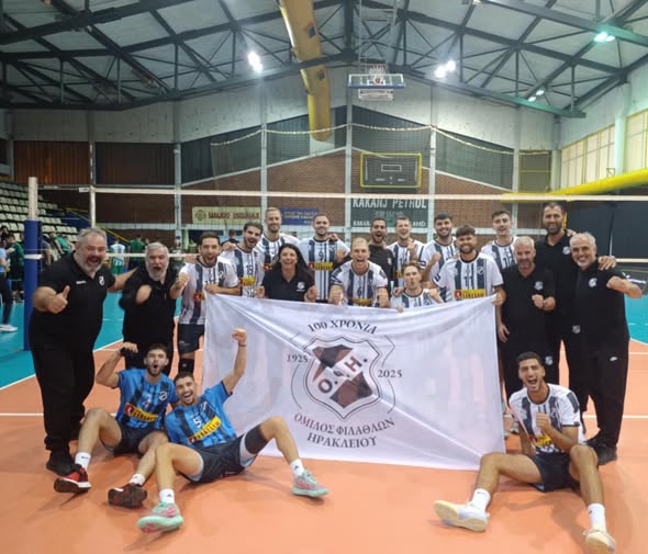 Στο τέλος του αγώνα, παίκτες και τεχνικό επιτελείο πανηγύρισαν κρατώντας τη σημαία των 100 χρόνων του συλλόγου, σε μια ιστορική στιγμή για τον κρητικό σύλλογο.