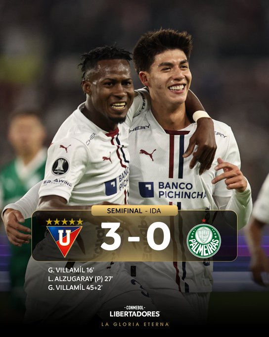 Ο Βιγιαμίλ πέτυχε δύο τέρματα και η ΛDU Κίτο επικράτησε με 3-0 της Παλμέιρας στο πρώτο ματς των ημιτελικών του Copa Libertadores, παίρνοντας ξεκάθαρο προβάδισμα πρόκρισης απέναντι στο μεγάλο φαβορί.