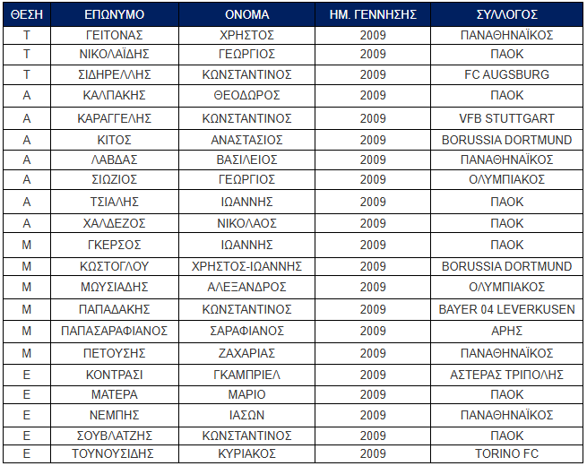 Ανακοινώθηκαν οι ποδοσφαιριστές που κάλεσε ο προπονητής της Εθνικής Παίδων, Βασίλης Παπαδάκης, για τη συμμετοχή της ομάδας στην πρώτη προκριματική φάση του Ευρωπαϊκού Πρωταθλήματος της κατηγορίας (14ος όμιλος), η οποία θα διεξαχθεί στην Τιφλίδα στο διάστημα 24-30/10/2025.