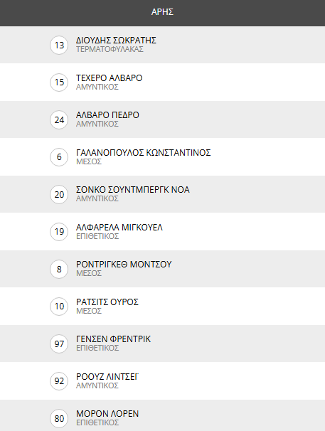 Μπορεί να είναι εικόνα ποδόσφαιρο, φούτμπολ και κείμενο που λέει "STARTINGXI EDRID 12 LODYGIN 02 KATRIS 03 VIHOS 06 TSAPRAS 24 LIAGKAS 23 23 COKAJ 11 BALZI 15 PEDROZO 31 SYMELIDIS 34 PALACIOS SUBS ANACKER, SOURDIS,FILON TSIVELEKIDIS, MAGNUSSON, MANTHATIS, TSHIBOLA, GKOUMAS, JALLOW, PLEGAS, VERBIC, JURIC Stoiximan ロ円 ABBASEIAKOE ARIS ービ. AYE #OneCityOneTeam"