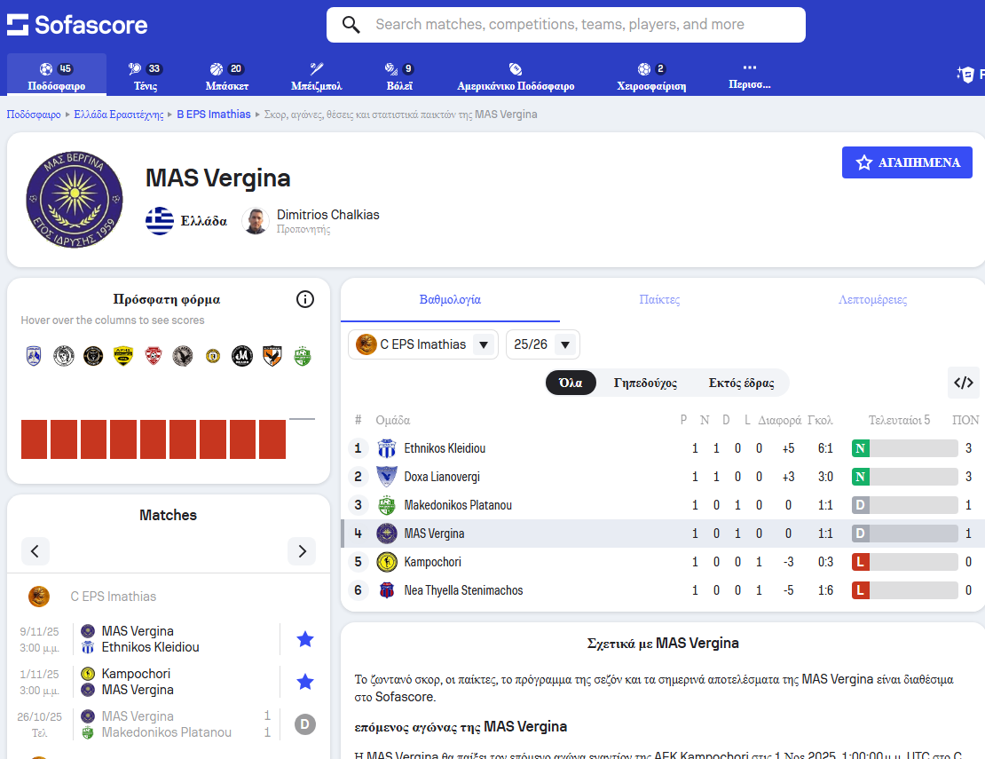 Το προφίλ του ΜΑΣ Βεργίνας στην εφαρμογή SofaScore ΕΔΩ