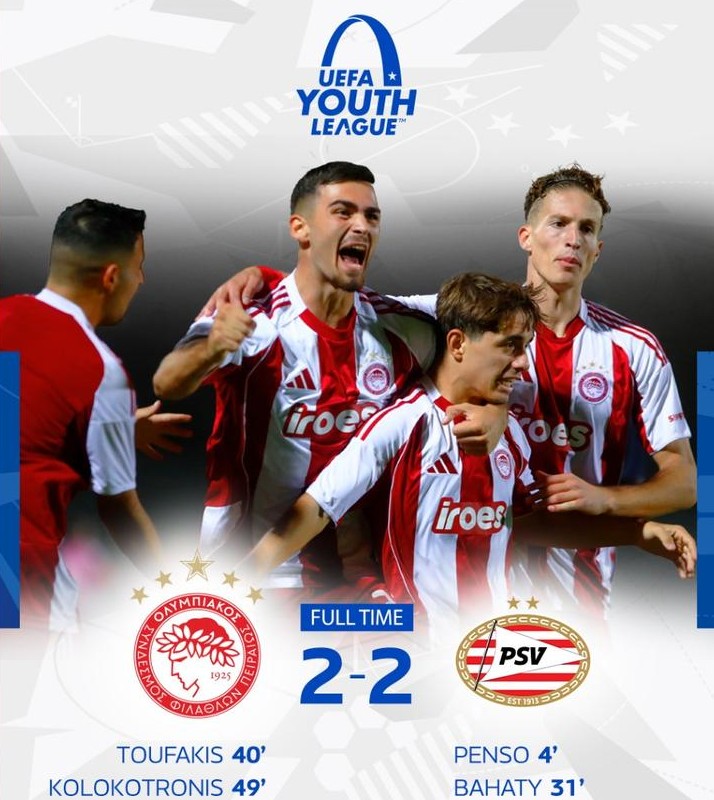 Η Κ19 του Ολυμπιακού έδειξε μέταλλο και νοοτροπία μεγάλης ομάδας απέναντι στην Αϊντχόφεν, μένοντας όρθια στο Ρέντη με 2-2, σε αναμέτρηση για την 4η αγωνιστική της League Phase του UEFA Youth League. Οι «ερυθρόλευκοι» του Γιώργου Σίμου βρέθηκαν να χάνουν με δύο γκολ, αλλά με πάθος και ποιότητα στην επίθεση κατάφεραν να ισοφαρίσουν, παραμένοντας μέσα στη μάχη της πρόκρισης.