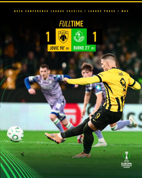 Η ΑΕΚ δεν κατάφερε να εκμεταλλευτεί την ανωτερότητά της απέναντι στη Σάμροκ Ρόβερς, μένοντας στο 1-1 στη Νέα Φιλαδέλφεια για την 3η αγωνιστική της League Phase του Conference League. Έτσι, ο «δικέφαλος» έφτασε τους 4 βαθμούς σε τρία παιχνίδια και πλέον έχει μπροστά του άλλες τρεις αναμετρήσεις για να εξασφαλίσει την πρόκριση, με την επόμενη να είναι εκτός έδρας απέναντι στη Φιορεντίνα.
