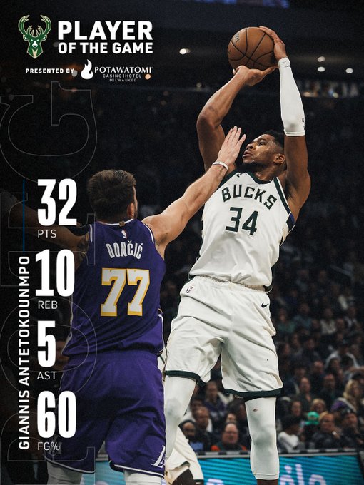 Ο Σλοβένος σούπερ σταρ είχε 41 πόντους, με 9 ριμπάουντ και 6 ασίστ, ενώ ο Αμερικανός γκαρντ πρόσθεσε 25 πόντους, 6 ριμπάουντ και 8 ασίστ, με τον Έιτον να τους συμπληρώνει με 20 πόντους και 10 ριμπάουντ. Για τους ηττημένους Μπακς, που εμφανίστηκαν χωρίς ενέργεια σε back to back αναμέτρηση για το NBA μετά τη νίκη τους επί τους Χόρνετς, οι Ρόλινς και Τρεντ Τζούνιορ ήταν ιδιαίτερα άστοχοι, με τον Έι Τζέι Γκριν να έχει 15 πόντους με 5/10 τρίποντα.