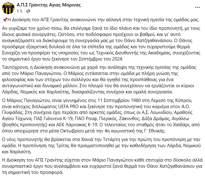 Σημαντικές εξελίξεις στον Γρανίτη Αγίας Μαρίνας, όπου η διοίκηση ανακοίνωσε την αλλαγή στην τεχνική ηγεσία. Παρότι εκφράζεται απόλυτη εκτίμηση για το έργο του Θάνου Χατζηαθανάσιου, τα αποτελέσματα οδήγησαν στη λύση της συνεργασίας, με τον ικανό τεχνικό να παραμένει ενεργό μέλος του συλλόγου ως Τεχνικός Διευθυντής της Ακαδημίας. Η διοίκηση υπογραμμίζει ότι η δουλειά του υπήρξε εξαιρετική και αναγνωρίζει πλήρως τη συνεισφορά του από τον Σεπτέμβριο του 2024.