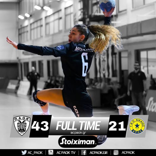 Ο ΠΑΟΚ συνέχισε με επιβλητική εμφάνιση, επικρατώντας 43-21 του Άρη Νικαίας και δείχνοντας από νωρίς τις διαθέσεις του. Η ομάδα του Πελεκίδη έτρεξε το παιχνίδι από το πρώτο λεπτό, «χτίζοντας» σταθερά διαφορά μέσα από την πίεση στην άμυνα και τους γρήγορους αιφνιδιασμούς. Η Μπουράτο με οκτώ τέρματα και η Μεντεσίδου με έξι ήταν οι πιο παραγωγικές, ενώ συνολικά δώδεκα παίκτριες βρήκαν δίχτυα, επιβεβαιώνοντας το βάθος του ρόστερ. Ο Άρης Νικαίας προσπάθησε μέσα από επιμέρους διαστήματα, όμως δεν μπόρεσε να ακολουθήσει τον ρυθμό του Δικεφάλου.