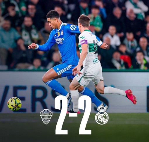 Σε μια αγωνιστική γεμάτη σασπένς στη La Liga, η Ρεάλ Μαδρίτης έμεινε στο 2-2 με την Έλτσε στο «Μανουέλ Μαρτίνεθ Βαλέρο», σημειώνοντας δεύτερη σερί ισοπαλία αλλά διατηρώντας την κορυφή με 32 βαθμούς, μόλις έναν πάνω από την Μπαρτσελόνα. Η ομάδα του Αλόνσο, με αρκετές απουσίες και σημαντικό ροτέισον ενόψει Ολυμπιακού, χρειάστηκε γκολ του Μπέλιγχαμ στο 87’ για να αποφύγει την ήττα, σε ένα δεύτερο μέρος που είχε ανατροπές και δοκάρι του Βινίσιους.