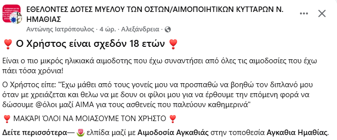 Μια ιδιαίτερα συγκινητική ιστορία προσφοράς ανέδειξαν οι Εθελοντές Δότες Μυελού των Οστών/Αιμοποιητικών Κυττάρων Ν. Ημαθίας, με πρωταγωνιστή τον Χρήστο, έναν νεαρό που πλησιάζει τα 18 και που ξεχωρίζει για τη διάθεσή του να βοηθήσει. Όπως τονίζει στην ανακοίνωσή του ο Αντώνης Ιατρόπουλος, πρόκειται για τον μικρότερο σε ηλικία εθελοντή αιμοδότη που έχει συναντήσει όλα αυτά τα χρόνια στις αιμοδοσίες.