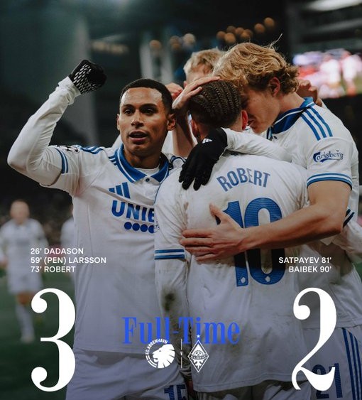 Η αυλαία της δεύτερης ημέρας της 5ης αγωνιστικής άνοιξε με δύο αναμετρήσεις γεμάτες ρυθμό, γκολ και ανατροπές. Στην Κοπεγχάγη, οι Δανοί επικράτησαν 3-2 της Καϊράτ Αλμάτι, σε ένα ματς όπου κυριάρχησαν για 75 λεπτά αλλά χρειάστηκε να αντέξουν την πίεση στο φινάλε. Ο Ντάντασον άνοιξε το σκορ στο 26’, ο Λάρσον έκανε το 2-0 από το σημείο του πέναλτι στο 59’, και ο Ρόμπερτ με μακρινό σουτ έγραψε το 3-0 στο 73’. Παρότι η Καϊράτ μείωσε με Σατπάεφ (80’) και Μπάιμπεκ (90’), η Κοπεγχάγη κράτησε το πρώτο της τρίποντο στη διοργάνωση και ανέβηκε στους 4 βαθμούς.