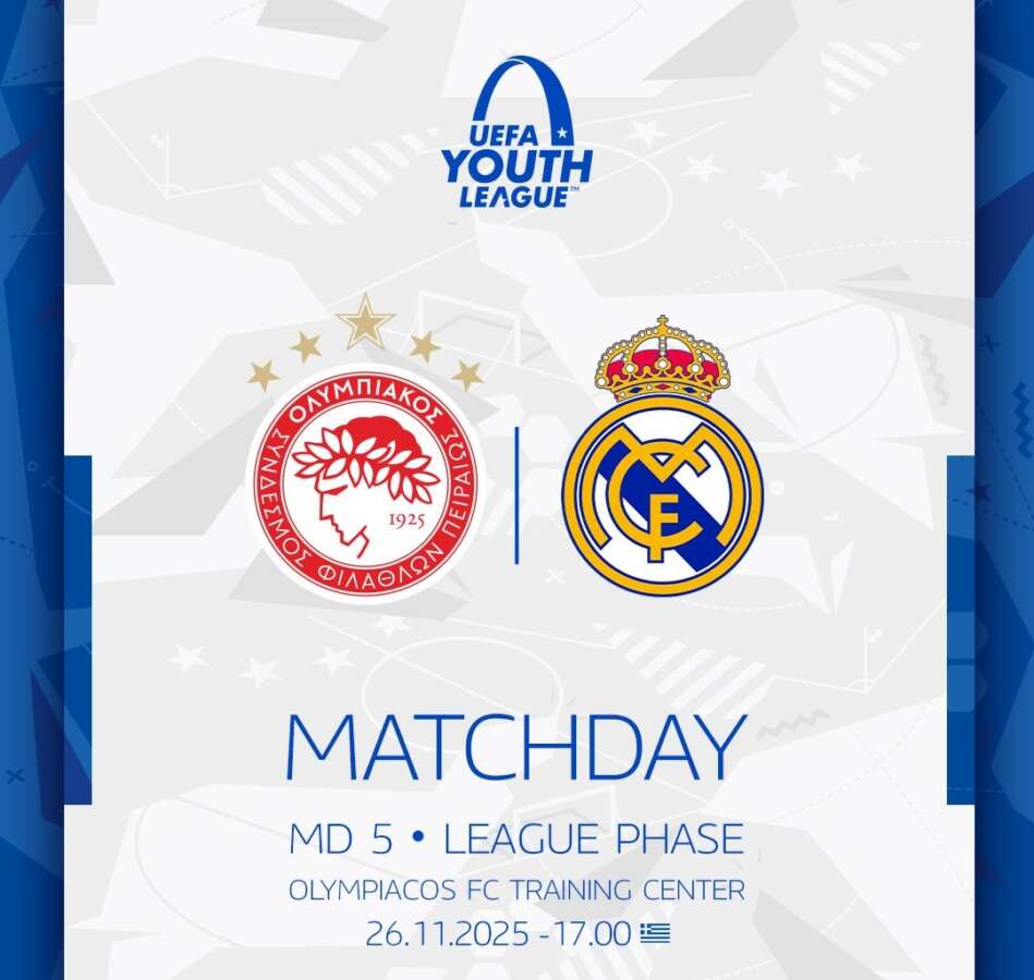 Ο Ολυμπιακός Κ19 είναι πανέτοιμος για τη μεγάλη αναμέτρηση με τη Ρεάλ σε λίγη ώρα (17:00), στο πλαίσιο της 5ης αγωνιστικής της League Phase του UEFA Youth League. Οι «ερυθρόλευκοι» θέλουν να δώσουν συνέχεια στις εξαιρετικές ευρωπαϊκές τους εμφανίσεις, επιδιώκοντας ακόμη ένα θετικό αποτέλεσμα.