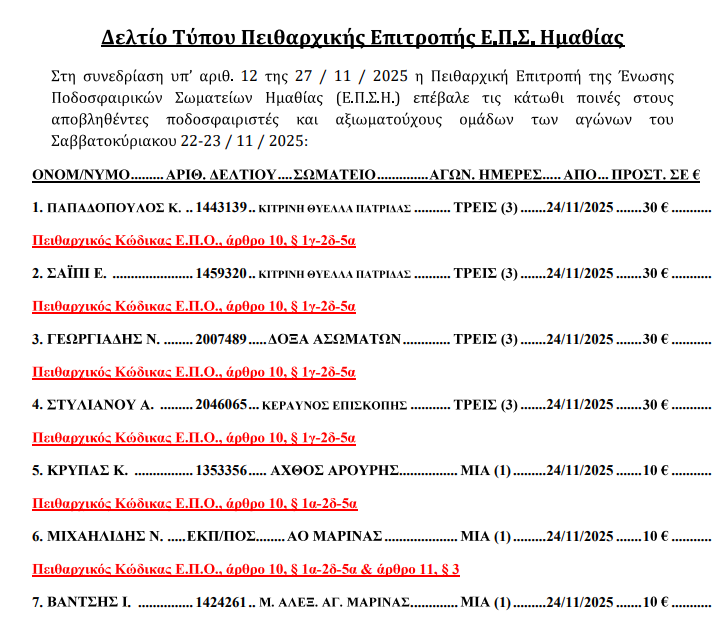 Η Πειθαρχική Επιτροπή της ΕΠΣ Ημαθίας ανακοίνωσε τις ποινές που επιβλήθηκαν σε επτά ποδοσφαιριστές για παραβάσεις στους αγώνες του Σαββατοκύριακου 22–23 Νοεμβρίου 2025.