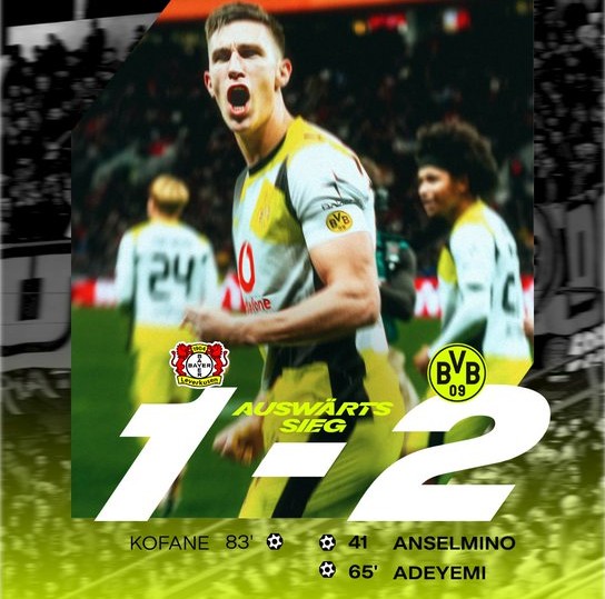 Οι “Βεστφαλοί” του Νίκο Κόβατς πήραν προβάδισμα στο 41’ με τον Ανσελμίνο, ενώ ο Αντεγιέμι διπλασίασε τα τέρματα της ομάδας στο 65’. Η Λεβερκούζεν μείωσε στο 83’ με τον Κοφανέ, αλλά το σκορ δεν άλλαξε, χαρίζοντας στην Ντόρτμουντ ένα σημαντικό τρίποντο.