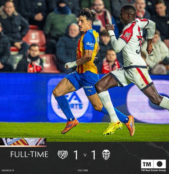 Ράγιο Βαγιεκάνο και Βαλένθια έμειναν στο 1-1 στο τελευταίο ματς της 14ης αγωνιστικής της LaLiga, σε μια αναμέτρηση που κρίθηκε στις λεπτομέρειες και στα στημένα. Η Ράγιο μπήκε πιο δυνατά και προηγήθηκε στο 37’, με τον Νόμπελ Μέντι να νικά τον Γκιόργκιεβ με δυνατή κεφαλιά έπειτα από εκτέλεση κόρνερ του Γκουμπάου. Η Βαλένθια, που παλεύει να απομακρυνθεί από τις χαμηλές θέσεις, ανέβασε ρυθμό στο δεύτερο μέρος και βρήκε την ισορροπία στο 64’, επίσης από στατική φάση, με τον Ντιέγκο Λόπεθ να εκτελεί από κοντά.