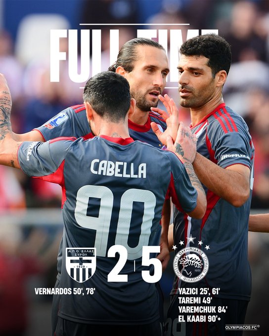 Ελλάς Σύρου – Ολυμπιακός 2-5 (50′ αυτογκόλ, 78′ Βερνάρδος / 25′-61′ Γιαζίτσι, 49′ Ταρέμι, 84′ Γιάρεμτσουκ, 90+1′ Ελ Καμπί)