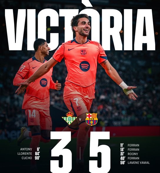 Η Μπαρτσελόνα ήταν εντυπωσιακή στην έδρα της Μπέτις, επικρατώντας με 5-3 σε ένα χορταστικό παιχνίδι που αύξησε τη διαφορά της από τη Ρεάλ Μαδρίτης στο +4 και της χάρισε την 6η διαδοχική νίκη στο πρωτάθλημα.