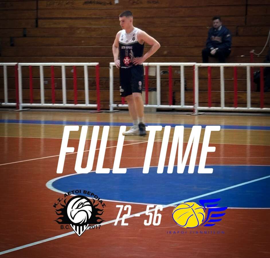 Με περιορισμένες επιλογές, οι Αετοί Βέροιας ολοκλήρωσαν τον πρώτο γύρο της ΕΚΑΣΚΕΜ με νίκη απέναντι στους Ικάρους Γιαννιτσών, επικρατώντας με 72-56 στο ΔΑΚ «Βικέλας». Η ομάδα του Αντώνη Δαχρετζή έπαιξε με μόλις επτά παίκτες, όμως έδειξε χαρακτήρα, πειθαρχία και ομαδικότητα.