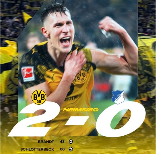 Η Ντόρτμουντ νίκησε 2-0 τη Χόφενχαϊμ χωρίς να εντυπωσιάσει, διατηρώντας αήττητη την παράδοση δέκα αγώνων εντός έδρας. Το πρώτο ημίχρονο ήταν φτωχό σε φάσεις, με το γκολ του Γιούλιαν Μπραντ στο 44’ να δίνει προβάδισμα στους γηπεδούχους, φτάνοντας το 200ό του στην καριέρα του στην Μπούντεσλιγκα. Στο δεύτερο ημίχρονο, ο Σβένσον δημιούργησε το δεύτερο γκολ που πέτυχε ο Σλότερμπεκ στο 60’. Η άμυνα της Ντόρτμουντ δεν απειλήθηκε καθόλου, ενώ ο προπονητής Ίλτσερ έκανε πέντε αλλαγές σε μέσους και επιθετικούς.