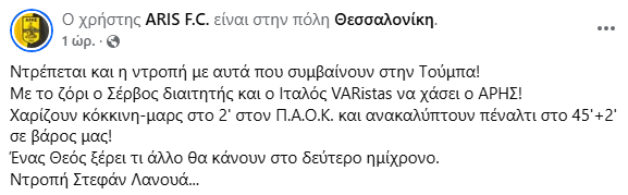 Στο ημίχρονο ο Άρης εξέδωσε ανακοίνωση για τη διαιτησία του Σέρβου ρέφερι της αναμέτρησης :