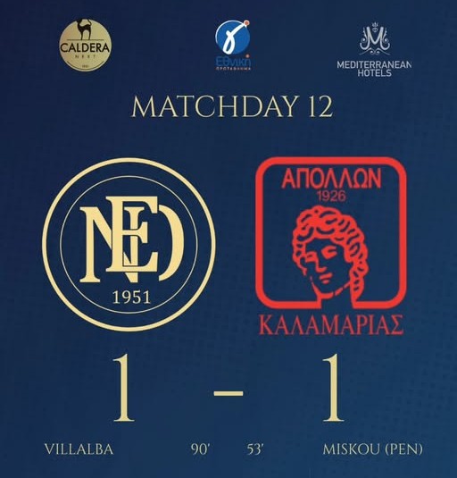 Όλα έδειχναν πως ο Απόλλων θα έφευγε με το διπλό, όμως στο 90+ ο Βιγιάλμπα βρήκε χώρο και με εύστοχο τελείωμα ισοφάρισε, γράφοντας το τελικό 1-1 και ξεσηκώνοντας τους φίλους της ομάδας στο Νέο Κεραμίδι.