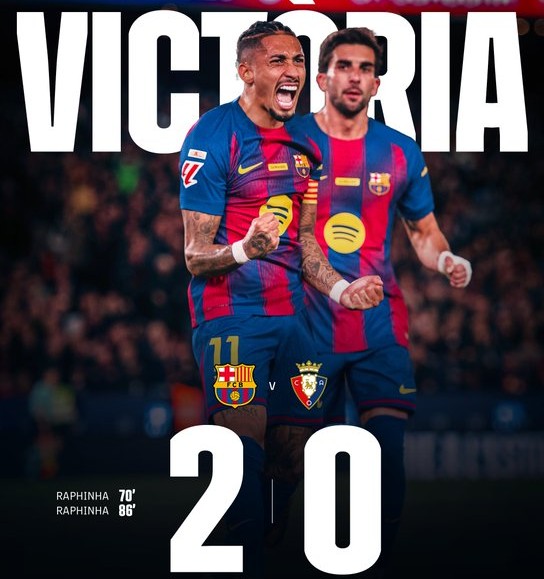 Η Μπαρτσελόνα επικράτησε 2-0 της Οσασούνα στο «Καμπ Νόου» για τη 16η αγωνιστική της LaLiga και συνέχισε την εντυπωσιακή της πορεία. Με τη 14η νίκη της στη σεζόν και έβδομη διαδοχική –κάτι που συμβαίνει για πρώτη φορά από το 2017– έφτασε τους 43 βαθμούς, ανοίγοντας τη διαφορά στους επτά από τη Ρεάλ. Οι «μπλαουγκράνα» κυριάρχησαν στο πρώτο ημίχρονο με 74% κατοχή και πολλές τελικές, όμως λύγισαν τη σφιχτή άμυνα των φιλοξενούμενων στο δεύτερο μέρος. Ο Ραφίνια άνοιξε το σκορ στο 70’ μετά από ασίστ του Πέδρι και στο 75’ διπλασίασε τα τέρματα εκμεταλλευόμενος λάθος απομάκρυνση. Η Οσασούνα έμεινε στους 15 βαθμούς.
