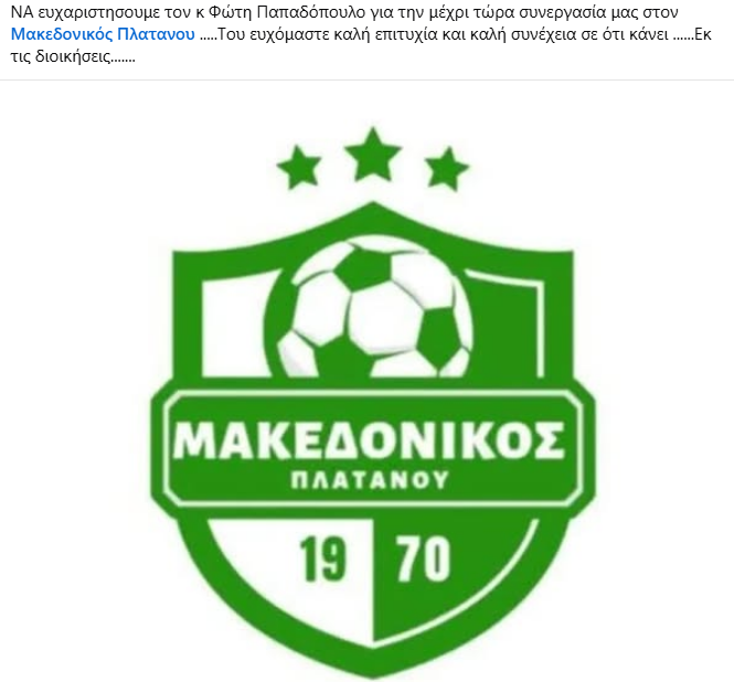 «Να ευχαριστήσουμε τον κ. Φώτη Παπαδόπουλο για τη μέχρι τώρα συνεργασία μας στον Μακεδονικός Πλατάνου. Του ευχόμαστε καλή επιτυχία και καλή συνέχεια σε ό,τι κάνει. Εκ της διοικήσεως.»
