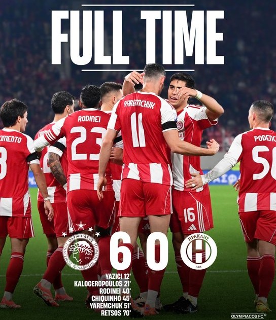 Με τον πιο πειστικό και θεαματικό τρόπο ολοκλήρωσε τη League Phase του Κυπέλλου Ελλάδας ο Ολυμπιακός, συντρίβοντας τον Ηρακλή με 6-0 στο «Γ. Καραϊσκάκης» και σφραγίζοντας την πρώτη θέση της βαθμολογίας. Οι «ερυθρόλευκοι» δεν άφησαν κανένα περιθώριο αμφισβήτησης, επιβεβαίωσαν απόλυτα τη διαφορά δυναμικότητας των δύο ομάδων και έκλεισαν τη φάση με απολογισμό 4 νίκες σε ισάριθμα παιχνίδια και εντυπωσιακό συντελεστή τερμάτων 18-3.