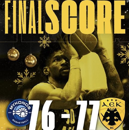 Η ΑΕΚ είδε στην τέταρτη περίοδο τη διψήφια διαφορά που είχε χτίσει να εξανεμίζεται και τη Μύκονο να επιστρέφει στο παιχνίδι, πήρε ωστόσο τη νίκη με 77-76 και επανήλθε στα θετικά αποτελέσματα στην GBL. Πλέον η Ένωση βελτίωσε το ρεκόρ της σε 6-4 έχοντας 4 εκτός έδρας νίκες, ενώ οι νεοφώτιστοι υποχώρησαν στο 4-6.