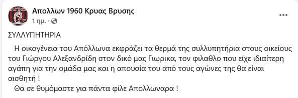 Ο Απόλλων Κρύας Βρύσης εκφράζει τη βαθιά του θλίψη για την απώλεια του Γιώργου Αλεξανδρίδη, του αγαπημένου «Γιωρίκα», ενός φιλάθλου που συνδέθηκε όσο λίγοι με την ομάδα. Η παρουσία του στις κερκίδες, η αγάπη και η αφοσίωσή του στον Απόλλωνα αποτέλεσαν διαχρονικό σημείο αναφοράς για όλους.