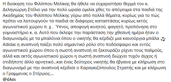 Μια ιδιαίτερα ενδιαφέρουσα και εκπαιδευτική ομιλία πραγματοποιήθηκε χθες το απόγευμα στην Ακαδημία του Φιλίππου Μελίκης, με έναν σημαντικό καλεσμένο. Ο Στέλιος Δεληγιώργης ανέλυσε στα παιδιά σημαντικά ζητήματα που αφορούν τη σωστή καθημερινή τους λειτουργία, κυρίως εκτός αγωνιστικού χώρου, όπως ο ύπνος, η διατροφή, η αποφυγή υπερβολικής χρήσης κινητού και η προπόνηση στο γυμναστήριο. Ξεχωριστή στιγμή αποτέλεσε ο διαγωνισμός με τα μπαλόνια, μέσα από τον οποίο αναδείχθηκε η σημασία της σωστής αναπνοής στο ποδόσφαιρο. Νικητές αναδείχθηκαν ο Στρατής Καραγκιζόπουλος και, έπειτα από κλήρωση, ο Στέργιος Γραμμένας.