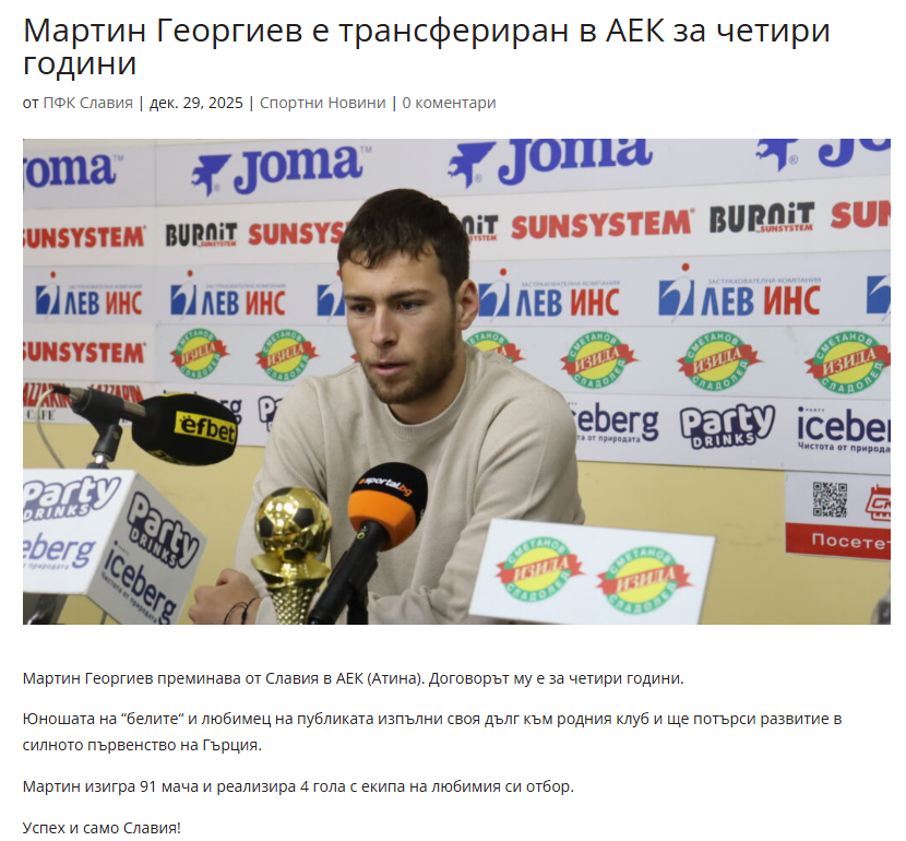 Η πρώτη μεταγραφική κίνηση της ΑΕΚ για την περίοδο του Ιανουαρίου είναι γεγονός. Η Ένωση ήρθε σε συμφωνία με τη Σλάβια Σόφιας για την απόκτηση του Μάρτιν Γκεοργκίεφ, με τη βουλγαρική ομάδα να ανακοινώνει επίσημα την πώληση του ποδοσφαιριστή.
