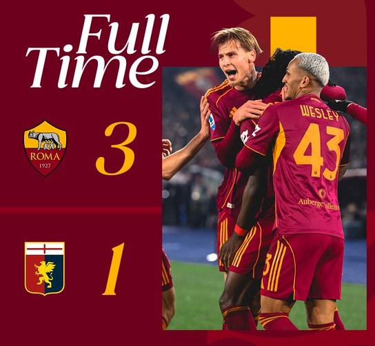 Στο τελευταίο παιχνίδι της Serie A για το 2025, η Ρόμα επιβεβαίωσε την εξαιρετική της κατάσταση, επικρατώντας 3-1 της Τζένοα σε ένα κατάμεστο Ολίμπικο. Το κοινό αποθέωσε τον Ντανιέλε Ντε Ρόσι, για πρώτη φορά ως αντίπαλο, όμως οι «τζαλορόσι» του Τζαν Πιέρο Γκασπερίνι φρόντισαν να «καθαρίσουν» το ματς από το πρώτο ημίχρονο.