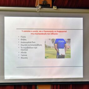 Με τη βοήθεια οπτικοακουστικού υλικού, παρουσίασε παραδείγματα και ανέλυσε διεξοδικά όσα οφείλουν να γνωρίζουν ποδοσφαιριστές, προπονητές και γονείς, με στόχο – πρωτίστως – τη διαμόρφωση σωστών ανθρώπων και στη συνέχεια ολοκληρωμένων αθλητών.
