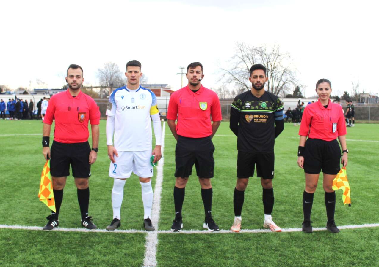 Η ομάδα του Κώστα Βελιτζέλου είχε από το ξεκίνημα τον πλήρη έλεγχο του αγώνα, πίεσε ψηλά, δημιούργησε συνεχώς φάσεις και δεν άφησε περιθώρια αντίδρασης στους φιλοξενούμενους. Το σκορ άνοιξε στο 43′, όταν ο Μυστρίδης με κεφαλιά, ύστερα από σέντρα του Βουκελάτου, έδωσε προβάδισμα στους γηπεδούχους.